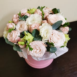 Шляпная коробка с цветами «Мираж» из роз и эустом