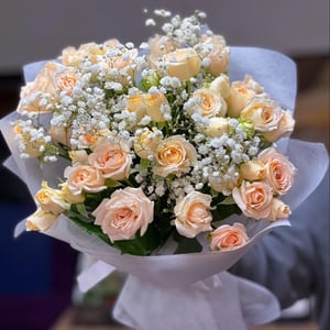 Корзина с цветами «Очарование Цветов» из роз и гипсофил