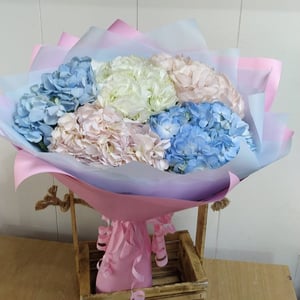 Букет «В фиолетовых тонах» из хризантем и гипсофил