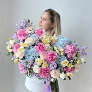 Летняя коробочка с цветами из роз и эустом