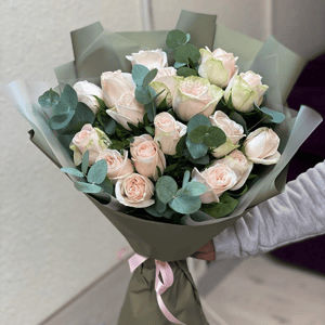 Коробка с цветами «Сумочка с цветами» из эустом и роз