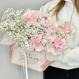 Шляпная коробка с цветами «Розовый закат» из гипсофил