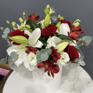 Шляпная коробка с цветами «Теплая встреча» из эустом и роз