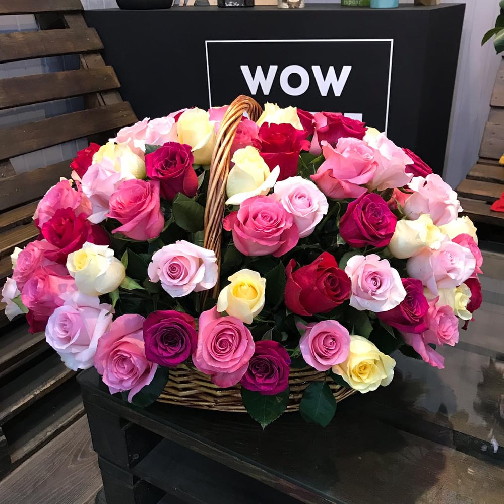 Невероятная цветовая гамма, яркая, сочная Всеми обожаемые нежные розы собрались в самых ярких оттенках в одной корзине