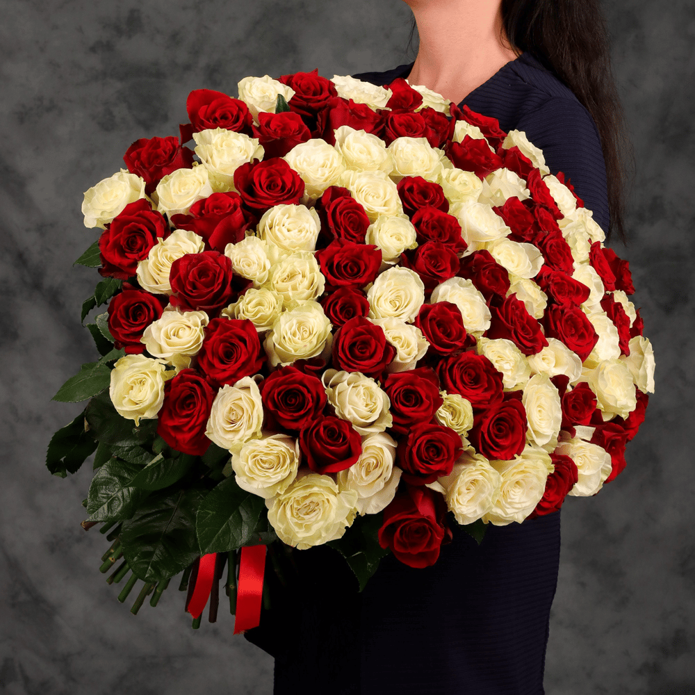 101 красная и белая эквадорская роза 60см: великолепный подарок для любого повода огромный букет из 101 красной и белой эквадорской розы станет незабываемым подарком для любого повода. Розы сор…