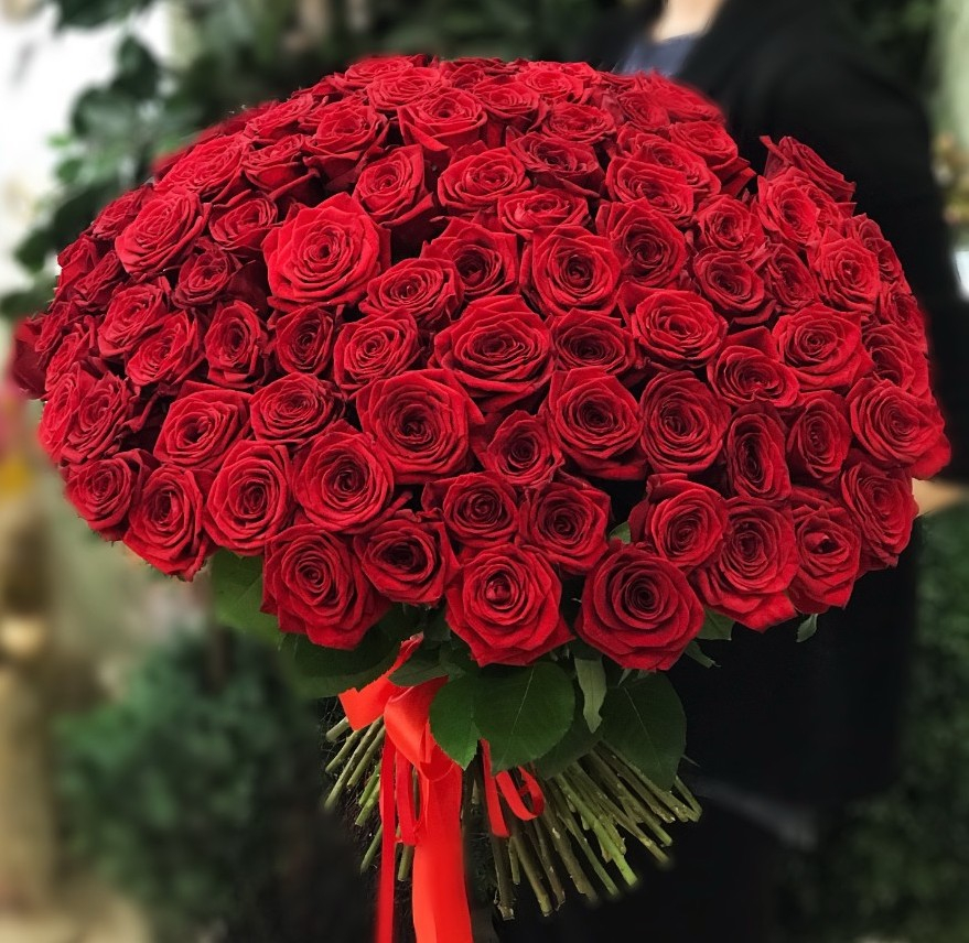 Букет из 101 красной розы 60 см. Оформление под атласную ленту.