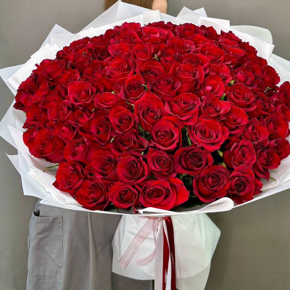 Подарите себе и своим близким непревзойденную красоту и элегантность с этим великолепным букетом из 101 красной розы высотой 60 см. Символ любви и страсти, красные розы всегда были идеальным подарк...