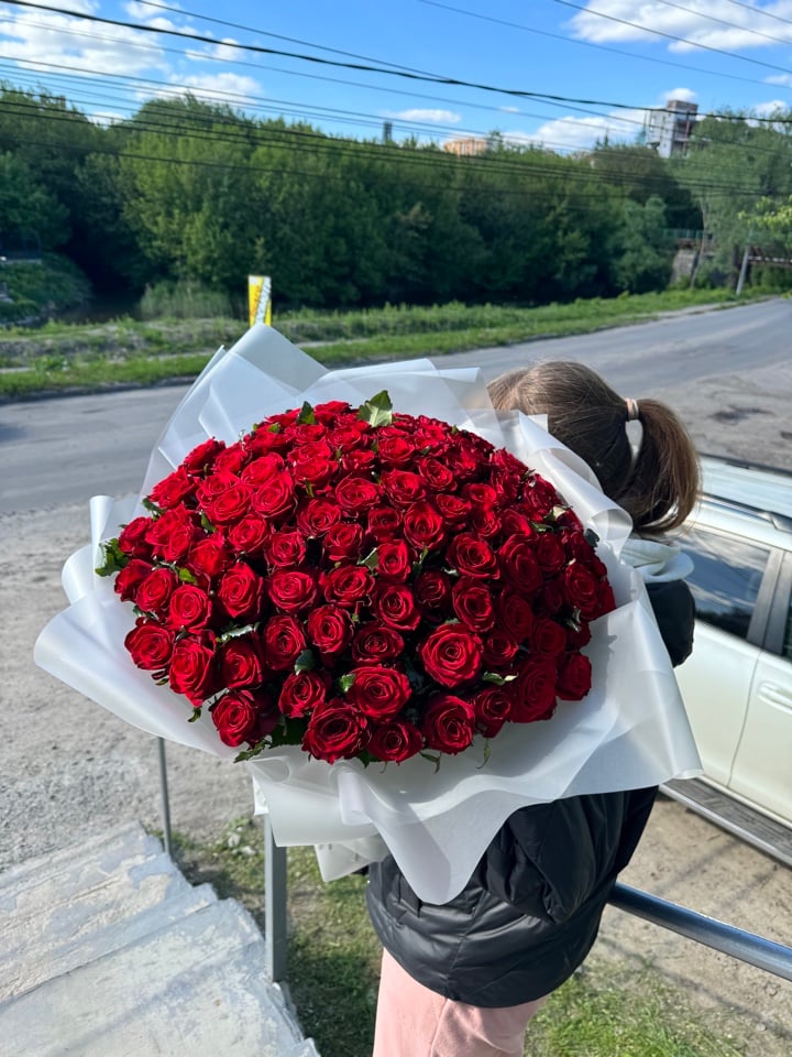 101 красная роза в стильной упаковке