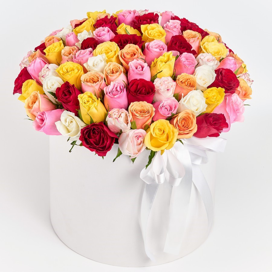 Шляпная коробка с цветами «101 разноцветная кенийская роза в коробе»