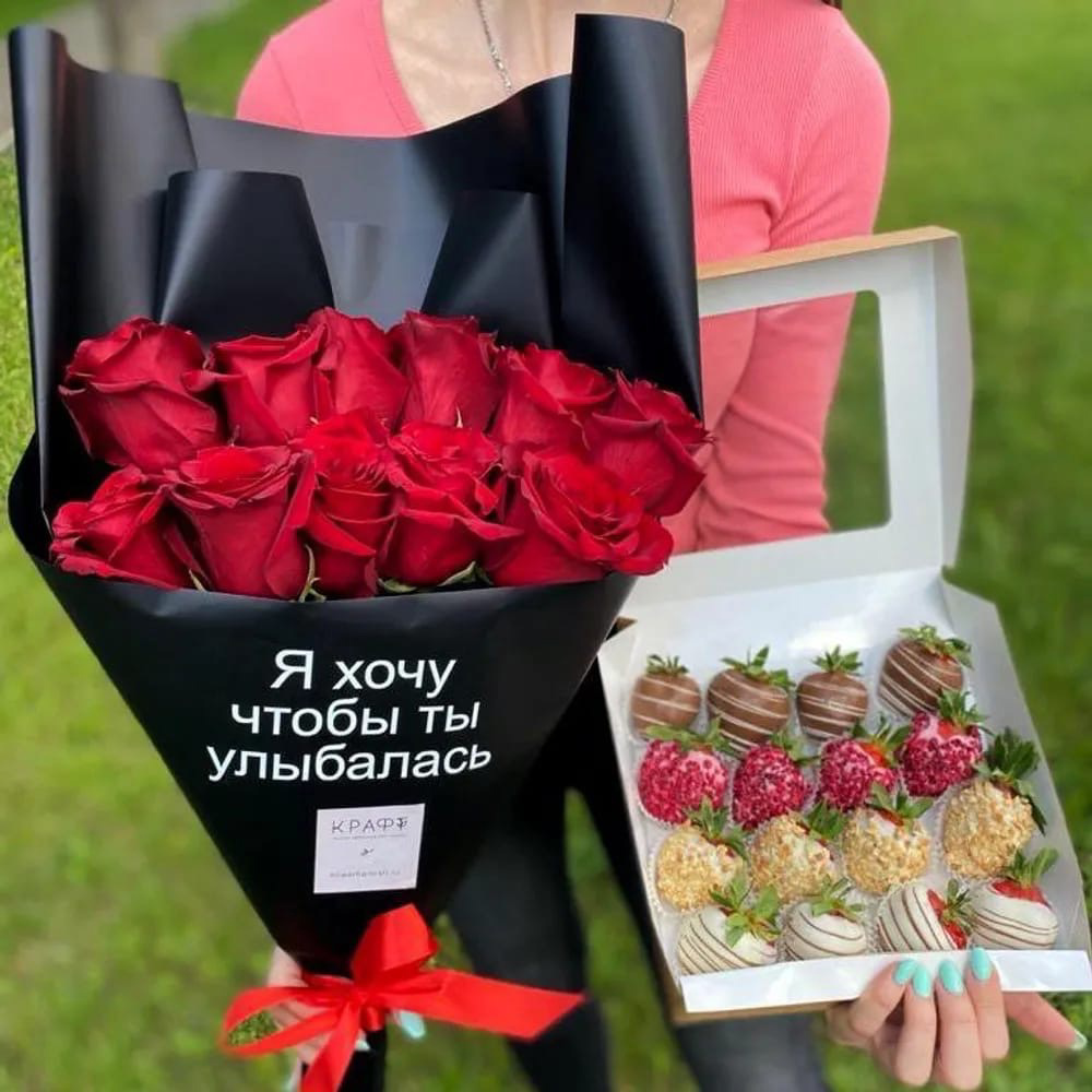 11 красных роз 60 см, коробочка клубники в шоколаде 16 шт.