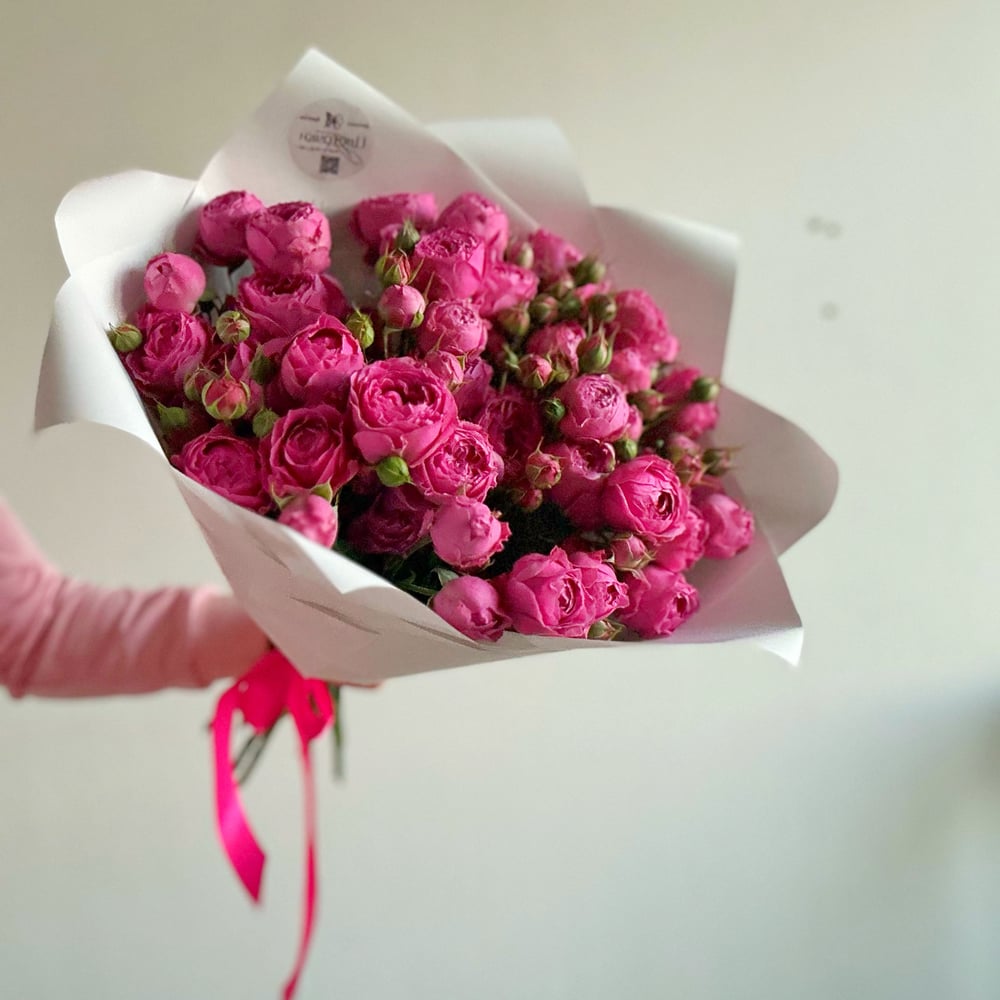 11 пионовидных ароматных малиновых кустовых роз Мисти Баблс в белом оформлении корейской пленки.