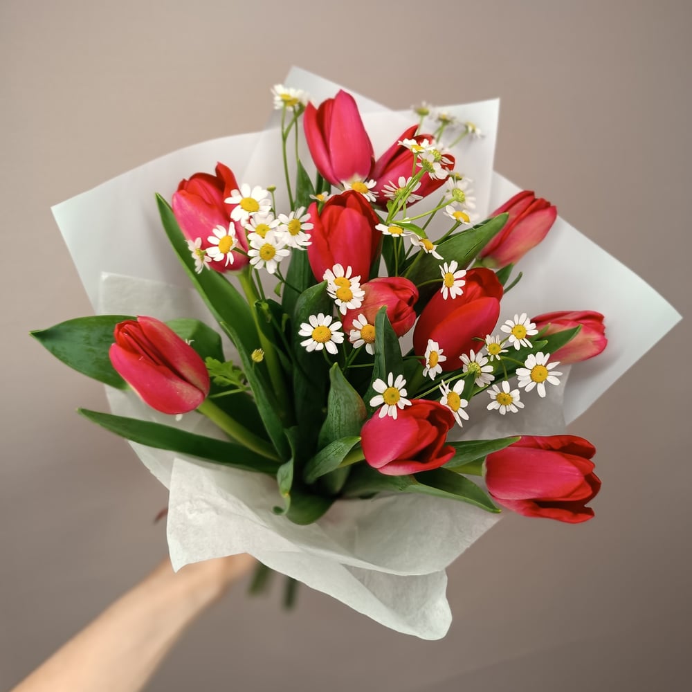Букет «11 тюльпанов и ромашки»