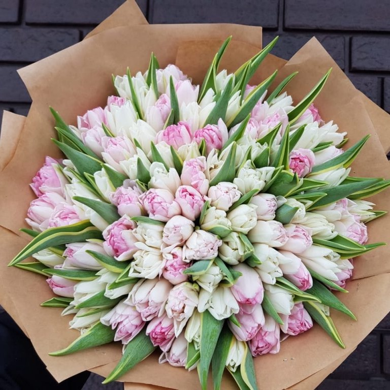 Букет с составом из 121 тюльпана в упаковке - это впечатляющая и богатая композиция, которая полностью поражает своим разнообразием цветов и нежностью цветочных бутонов. Упаковка сделана с изысканн...