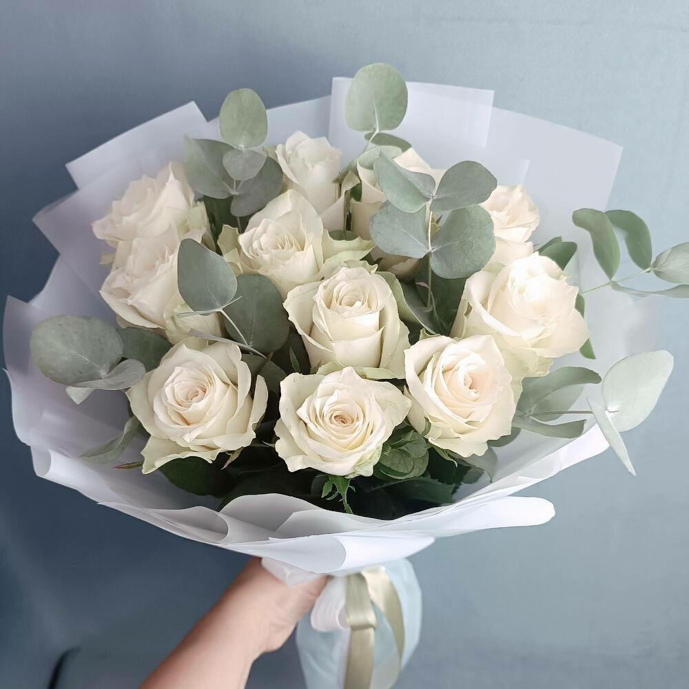 Букет «13 белых роз с эвкалиптом в упаковке»