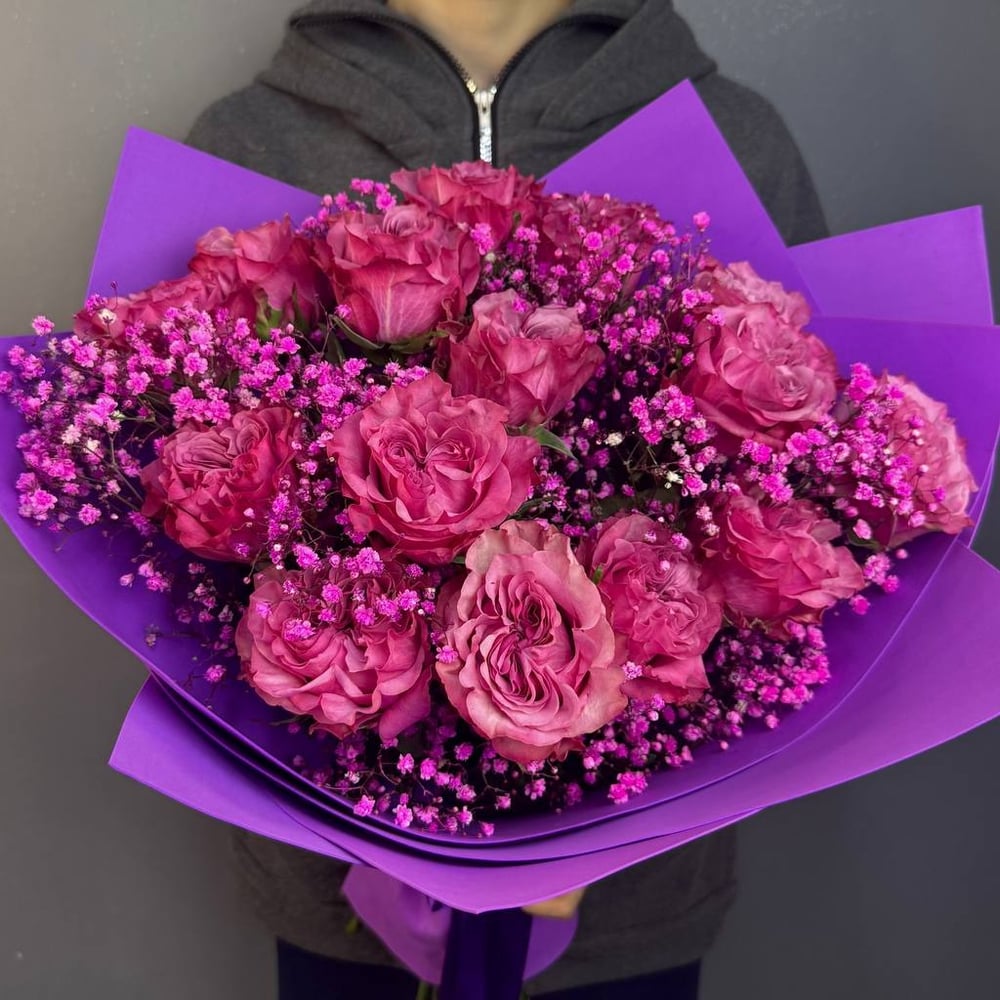15 пионовидных розовых роз 3 ветки розовой гипсофиллы флористическая упаковка