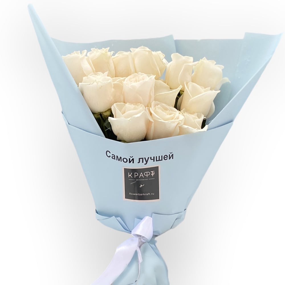 15 белых роз в нежно голубой упаковке