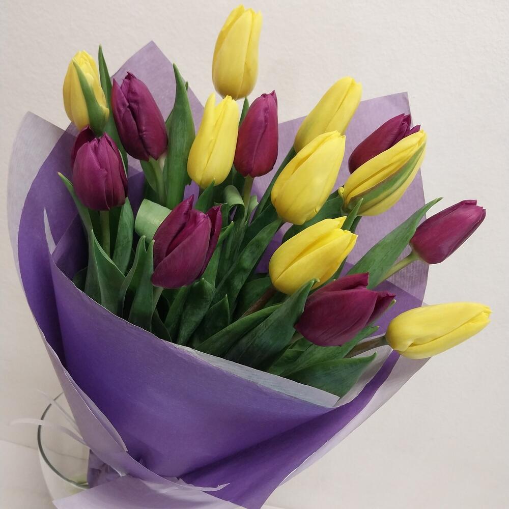 Букет «15 жёлтых и фиолетовых тюльпанов»