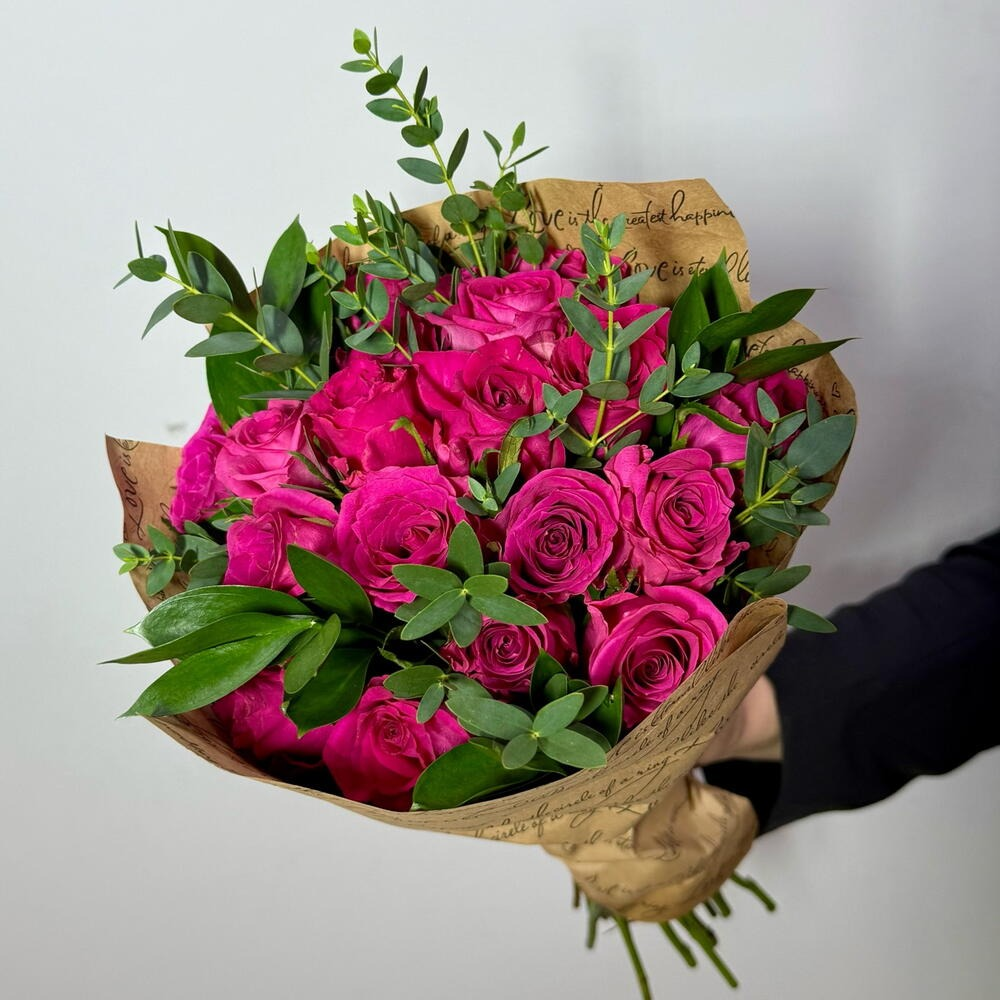 19 роз фуксия с эвкалиптом. В дополнении к нашим букетам идет Сладкий подарок от магазина