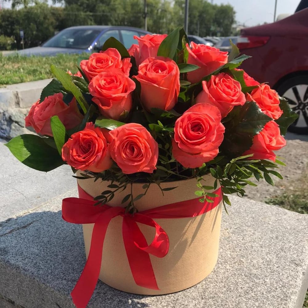 Шляпная коробка с цветами «19 рыжих роз»