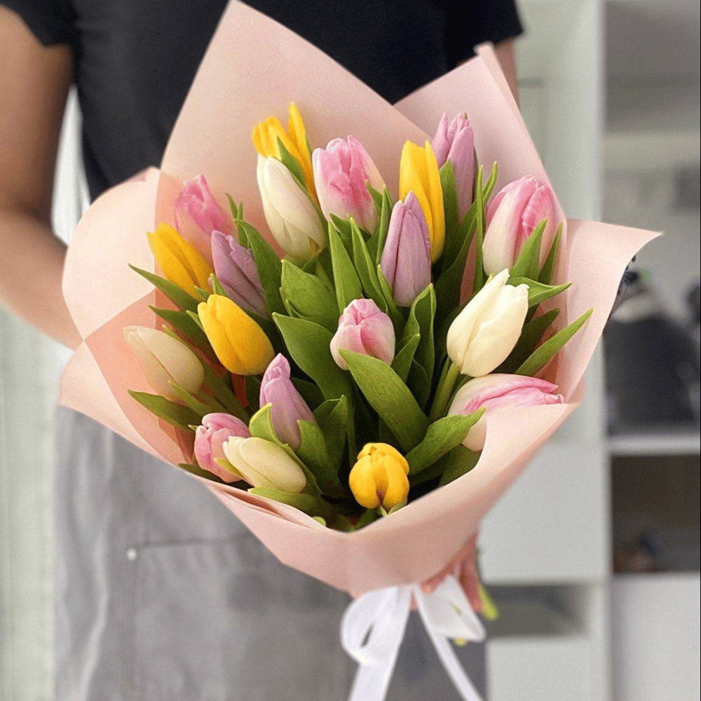 19 разноцветных тюльпанов — как 19 причин улыбнуться прямо сейчас! Они переговариваются между собой на языке красок: кто‑то кричит, кто‑то шепчет, кто‑то подмигивает. И всё это — в стильной авторской упаковке