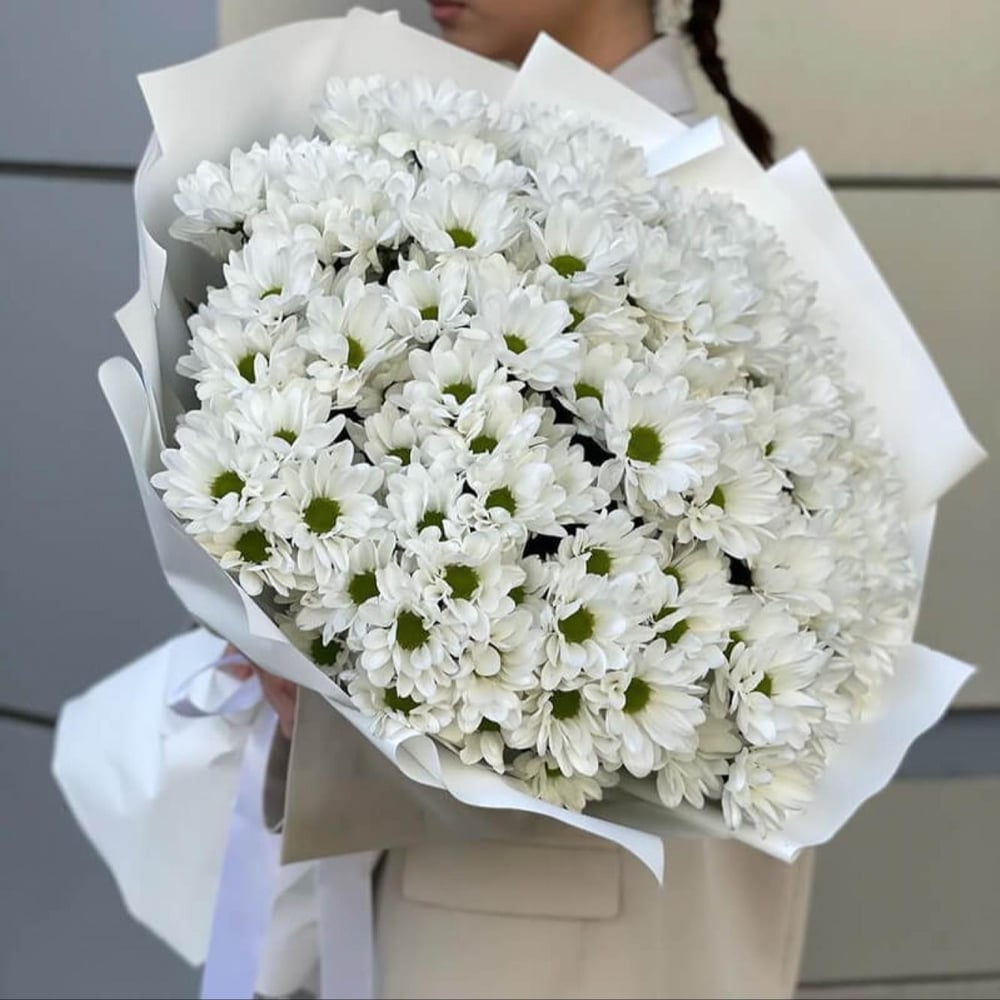 Невероятной красоты облако белой хризантемы с оформлением - будет как никогда кстати на День Рождение или юбилей. Также с таким букетом можно признаться в любви. Такой букет будет радовать долгое вре…
