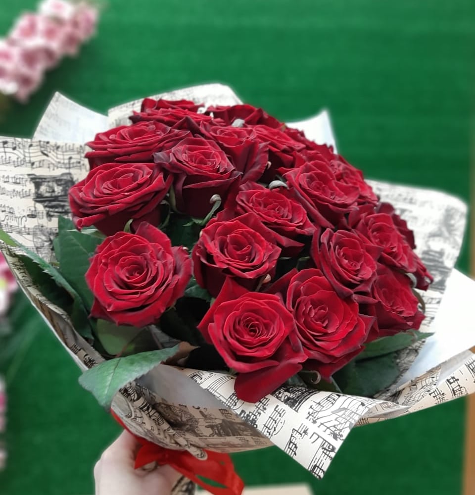 25 бордовых роз в крафте - это великолепный подарок любимому человеку.