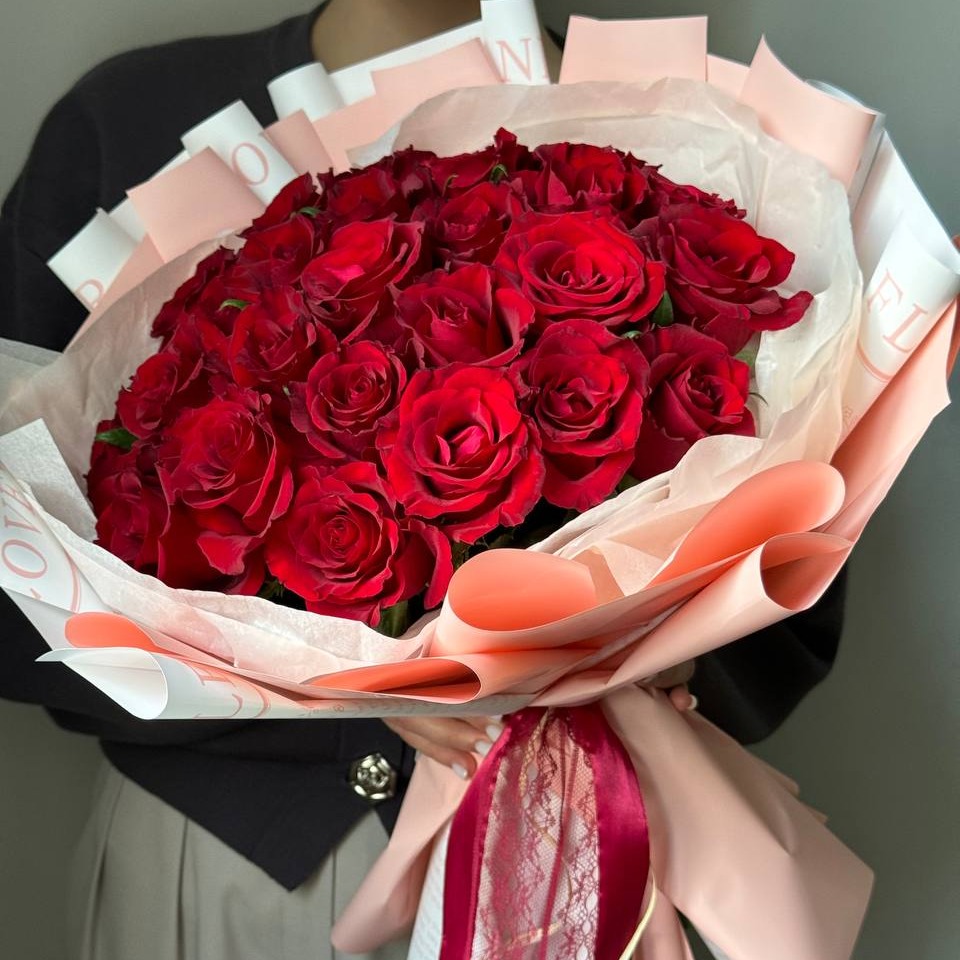 букет из 25 пылающих красных кенийских роз. Это не просто цветы, это воплощение страсти и элегантности. Кенийские розы славятся своим насыщенным цветом и крупными, бархатистыми бутонами. 25 таких роз, собранные вместе, создают впечатляющий и запоминающийся подарок.