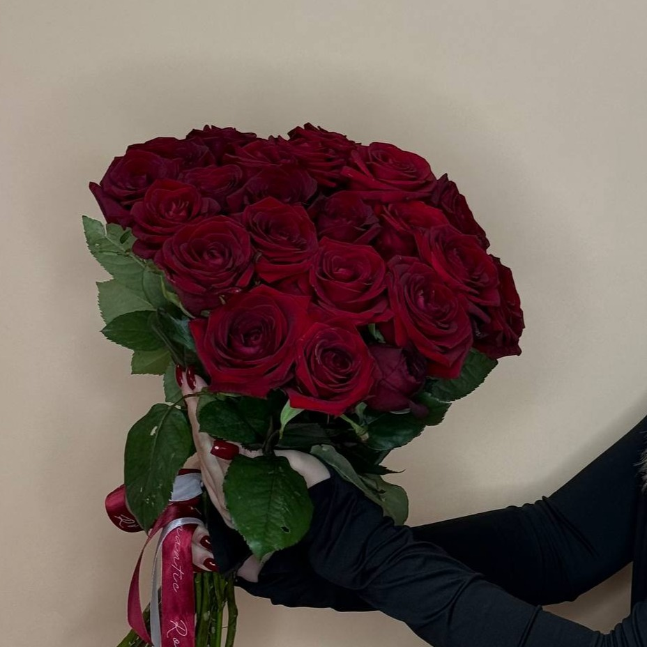 25 красных роз в букете под ленту