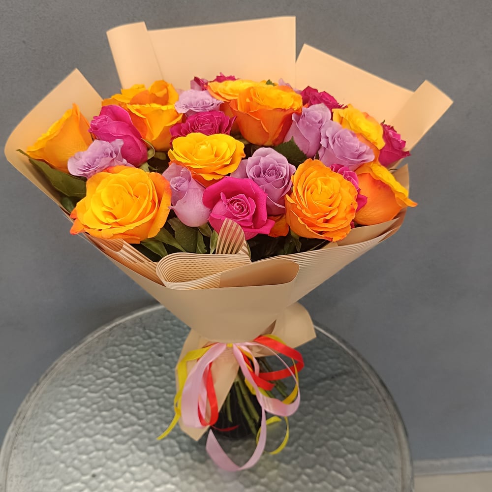 Яркий букет из ароматных разноцветных роз в современной упаковке