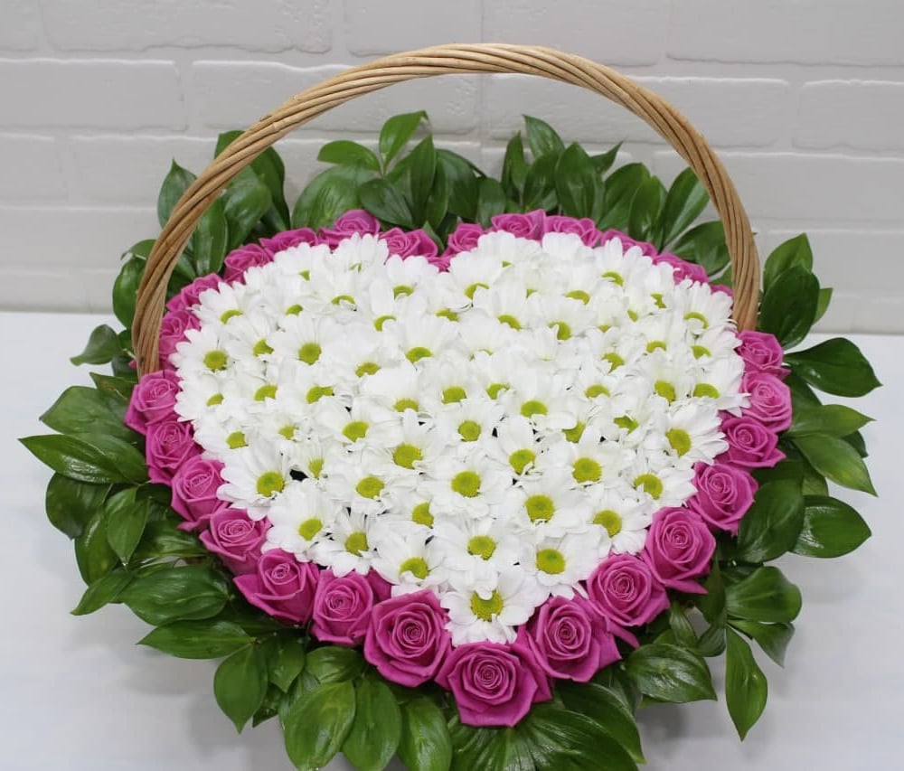 Композиция «29 роз с хризантемами в виде сердца»