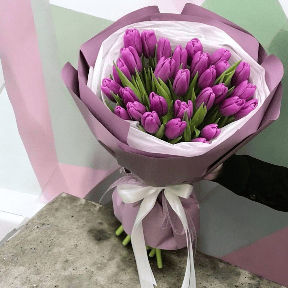 Фиолетовые тюльпаны в авторской упаковке — это как секретный код элегантности. Они шепчут о вкусе того, кто подарил, и радуют того, кто получил. Букет с характером и стилем