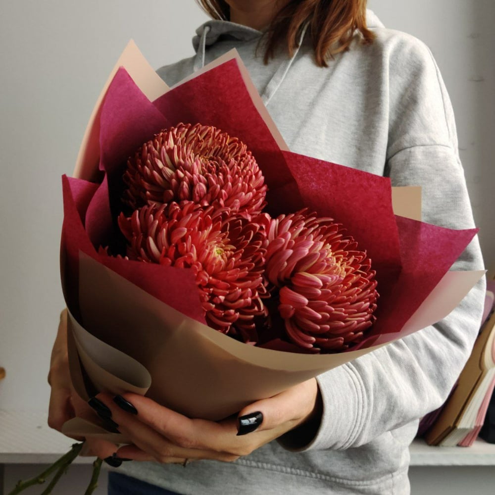 Этот букет из хризантем сорта «Бигуди Бордо» — настоящее воплощение элегантности и утонченности. Цветы насыщенного бордового оттенка создают глубокий и выразительный образ. Лепестки хризантем имеют форму кружевных завитков, что придает композиции изысканность и изящество. Букет оформлен в минималистичной упаковке, что подчеркивает естественную красоту цветов. Такой букет идеально подойдет для романтического вечера, особого праздника или просто для того, чтобы порадовать близкого человека.