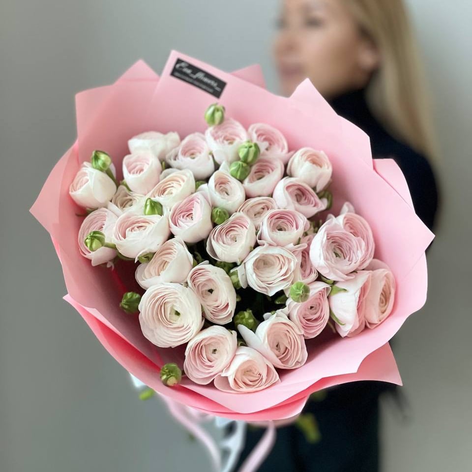 Стильный монобукет с ранункулюсами — прекрасный подарок для любой девушки. Ведь каждая представительница прекрасного пола мечтает о таком букете.