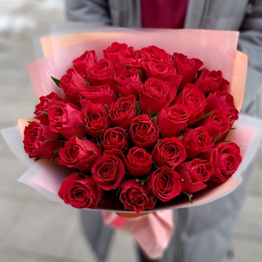 Яркий букет из 33 красных роз длины 40 см в двойной упаковке