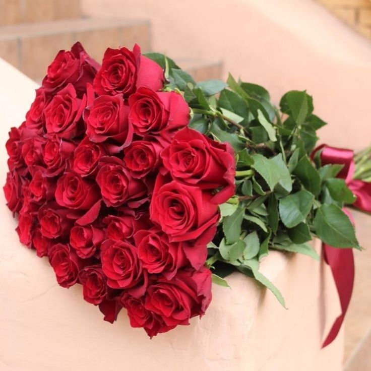 Огромный букет классических бордовых роз 35шт под ленту