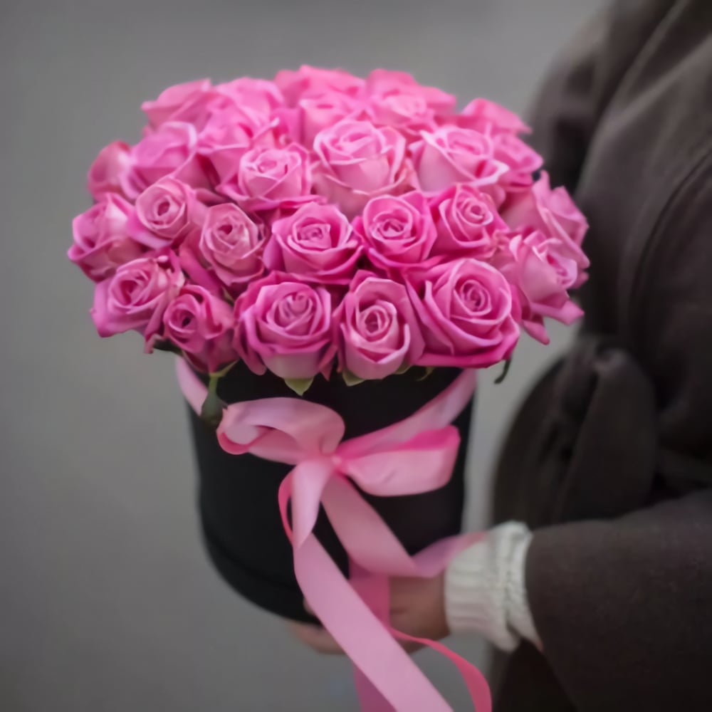 Шляпная коробка с цветами «35 розовых роз в коробке»