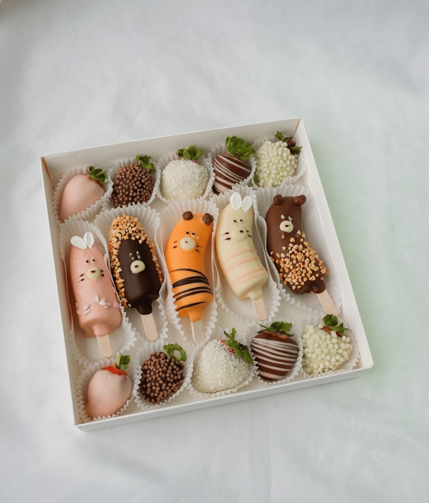 "Набор — клубника и бананы в шоколаде с дизайном звери — яркий детский десерт 🐻🍓🍌 Свежая клубника и бананы покрыты белым, молочным и клубничным бельгийским шоколадом. Бананы украшены милыми…