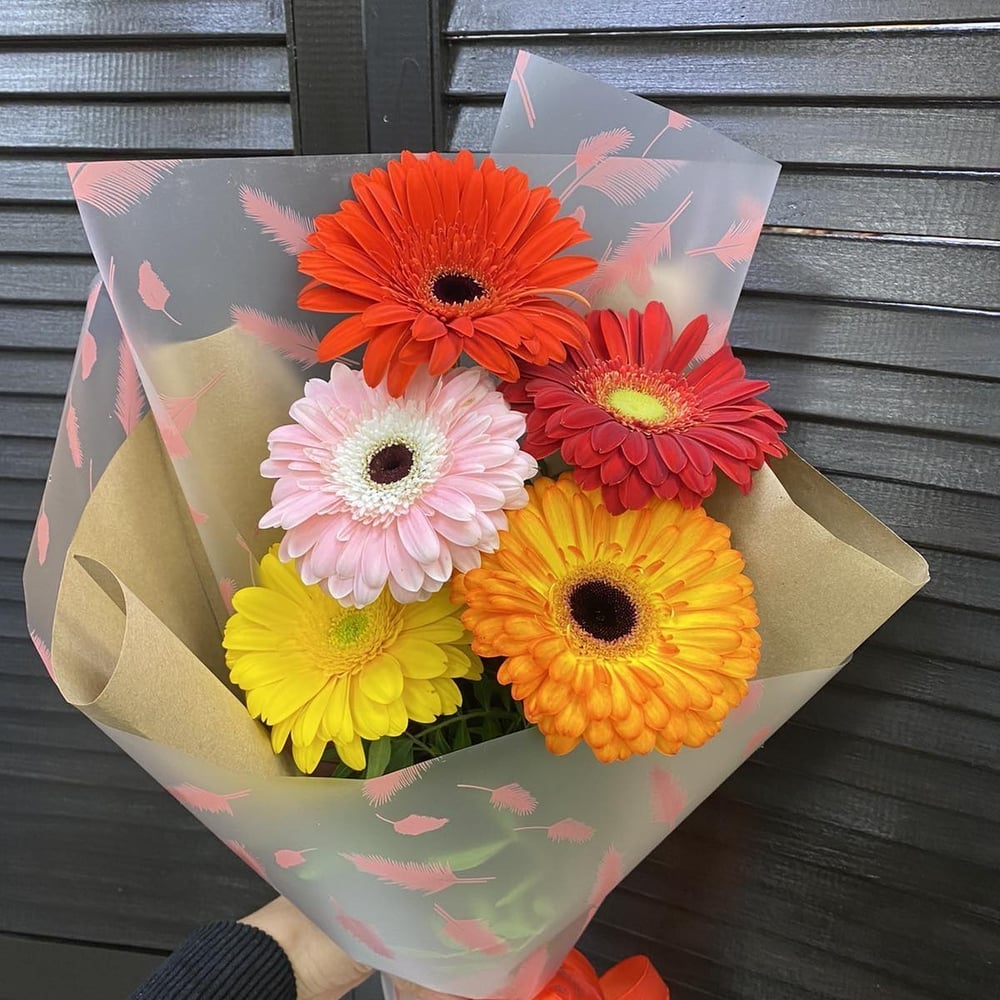 Букет «5 гербер с зеленью в оформлении»