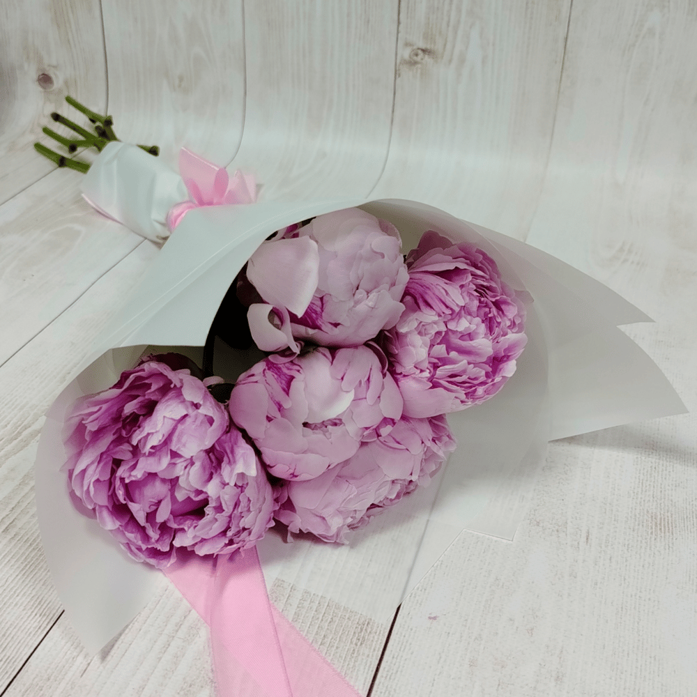 Букет из 5 розовых пионов Сара Бернар в дизайнерской упаковке под атласную ленту.