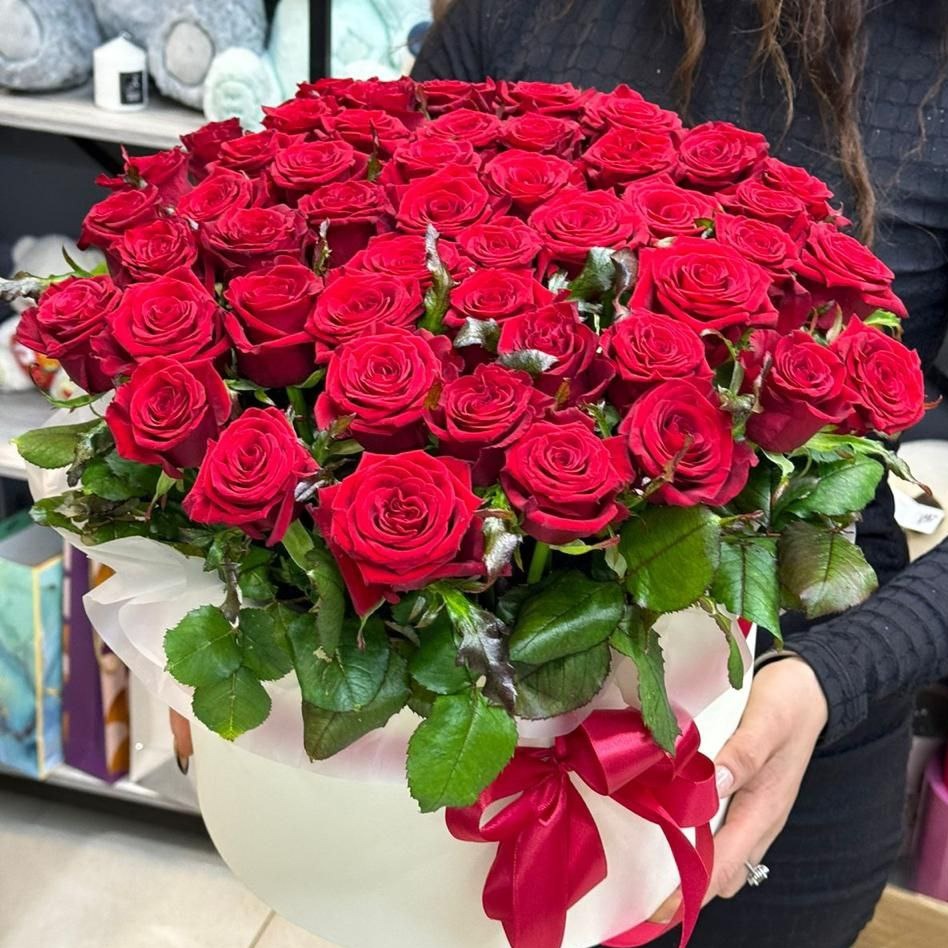 Представьте себе роскошную композицию из 51 алой розы, заключённую в стильную шляпную коробку – это идеальный способ выразить самые глубокие чувства! Такой букет станет впечатляющим подарком по любому поводу: день рождения, юбилей или просто знак внимания любимому человеку. Розы долго сохраняют свою свежесть благодаря уникальной упаковке, которая защищает их от внешнего воздействия. Это сочетание красоты, элегантности и искренних эмоций, обрамлённое в безупречную подарочную форму. Порадуйте своих близких этим восхитительным цветочным