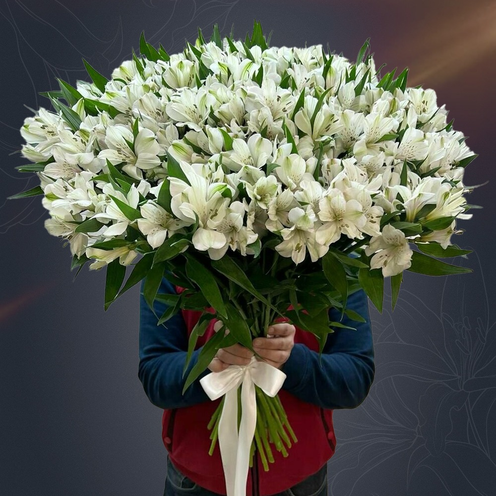 Классический монобукет из 51 белой альстромерии с атласной лентой - это изысканный и стильный подарок, который станет незабываемым сюрпризом для любого торжества или особого случая. Альстромерии в со…
