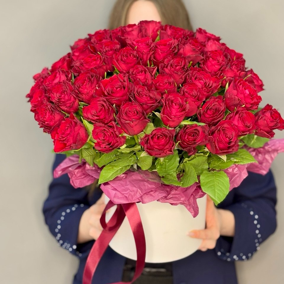 Композиция в шляпной коробке с красными розами — это эффектное и элегантное оформление, которое отлично подходит для подарка или украшения особого события. В такую коробку обычно размещают яркие, с...