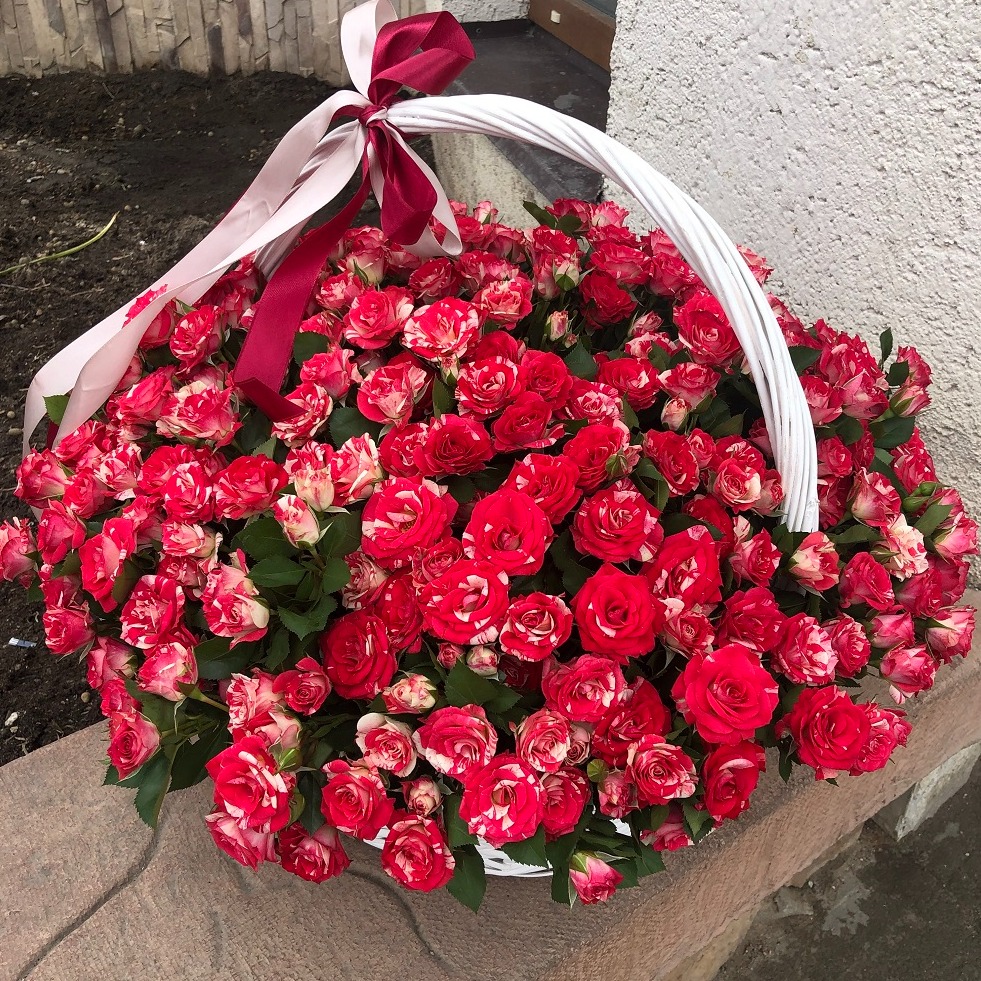 51 кустовая роза Fireworks в плетёной корзине с атласными лентами.