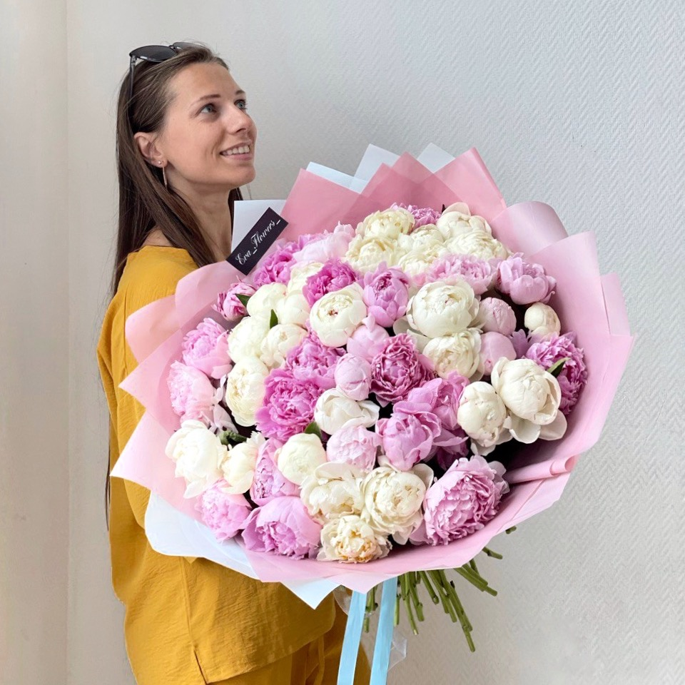 Этот великолепный букет из 51 пиона сочетает в себе нежность белых и розовых оттенков, создавая гармонию чистоты и романтики. Белые пионы символизируют невинность и элегантность, тогда как розовые привносят в композицию тепло и чувственность. Этот микс идеально подойдет для особых моментов, будь то свадьба, юбилей или просто знак внимания любимому человеку. Позвольте этим цветам рассказать историю любви и красоты, которая очарует любого получателя.