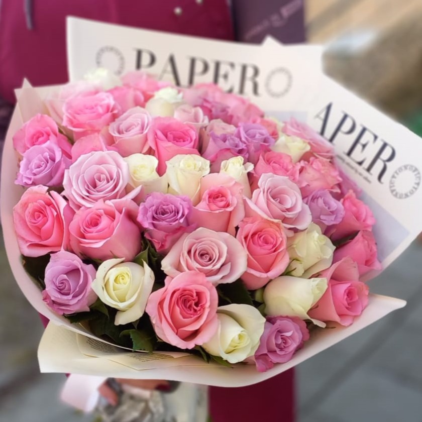 Нежный букет из 51 розы длины 40 см в современной упаковке