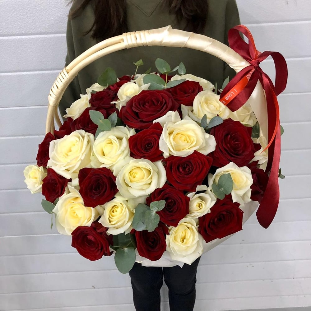 Объемная плетеная корзина из 51 ароматной российской розы и итальянского эвкалипта произведет неповторимое впечатление на получательницу.