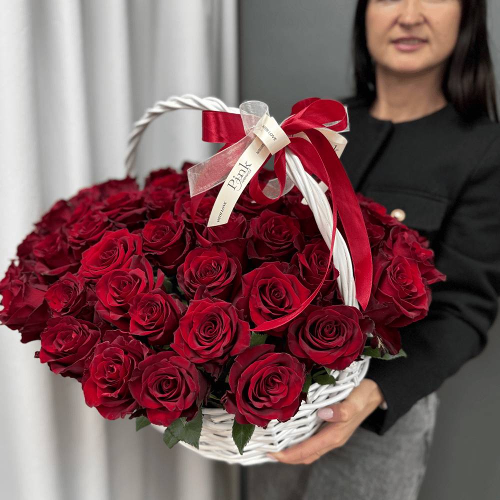 51 Роза LUXE в корзине. Эффектная и красивая корзина с красными розами