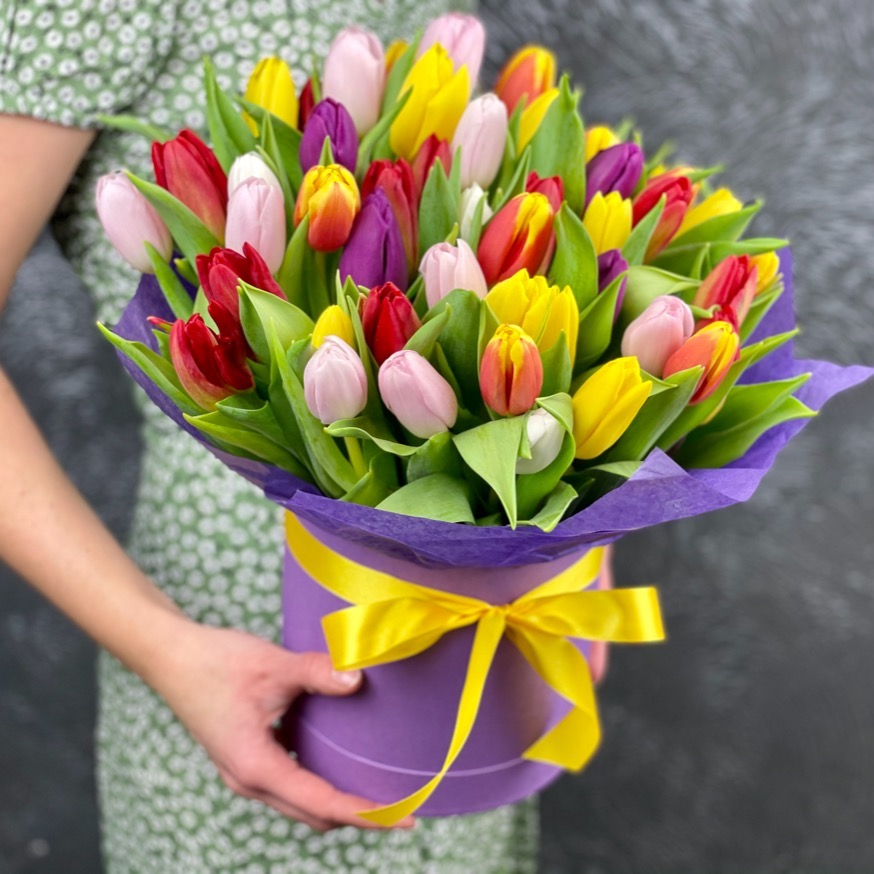 51 тюльпан в шляпной коробке