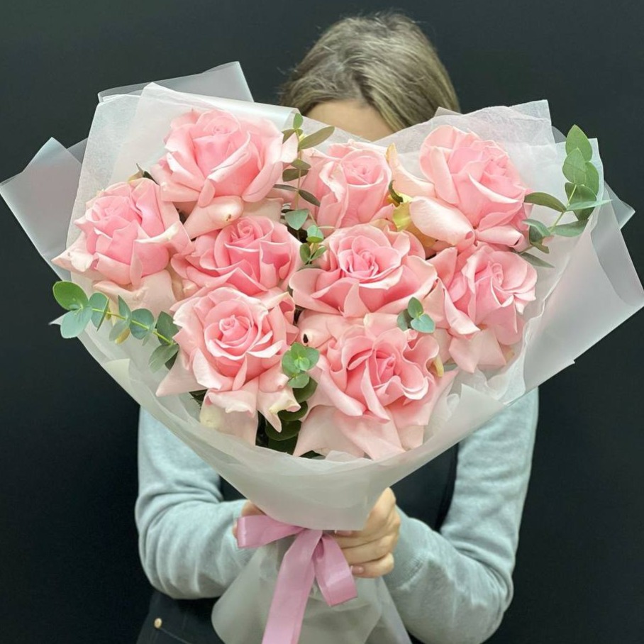 9 нежных роз в оформление с эвкалиптом