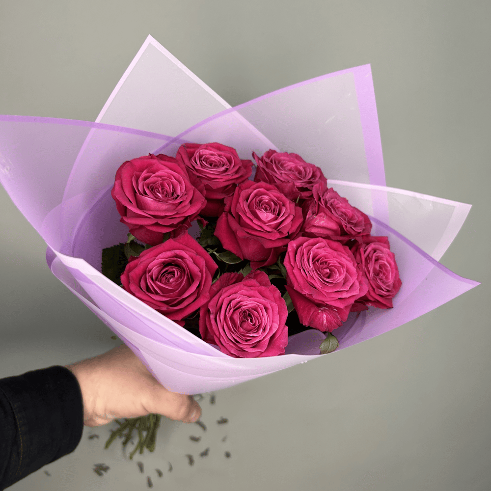 Прекрасный букет из 9 роз малиновых в упаковке